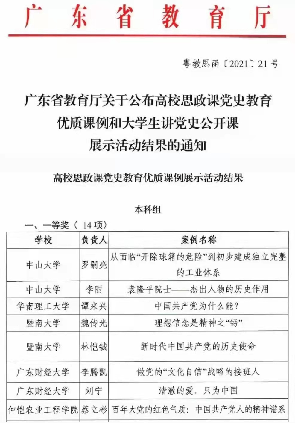 10月21日,广东省教育厅印发了《关于公布高校思政课党史教育优质课例和大学生讲党史公开课展示活动结果的通知》(粤教思函[2021]21号),正式公布了广东省高校思政课党史教育优质课例和大学生讲党史公开课展示活动结果获奖名单。其中,高校思政课党史教育优质课例一等奖29项、二等奖50项、三等奖80项。经各高校推荐和组织专家评审,我校402永利集团官网蔡立彬老师提交的课例《百年大党的红色气质:中国共产党人的精神谱系》喜获一等奖。