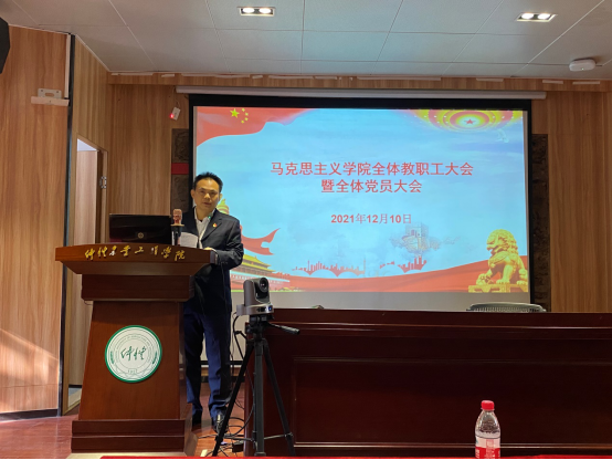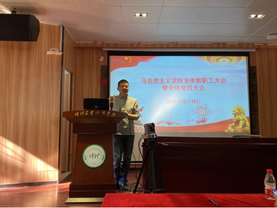 蔡院长首先指出,习近平总书记“3.18讲话精神”为马院发展指明了前进道路和发展方向,为马院教师提供了强大的动力源泉和精神支持。全体思政课教师应当在习近平总书记“3.18讲话精神”的指引下,充分发挥专业课与思政课的协同效应,坚持守正创新,推进思政课改革创新和课程思政建设。其次,蔡院长传达学习习近平总书记在庆祝中国共产党成立100周年大会上的重要讲话精神,带领与会人员重点学习了伟大的建党精神的科学内涵和现实意义。我们要牢牢把握新时代弘扬伟大建党精神的重大意义和实践要求,通过多种形式和扎实举措,让伟大建党精神融入思政课教学。再者,会上继续学习习近平总书记在纪念辛亥革命110周年大会上的重要讲话精神,并深刻认识到要在回顾革命历程中汲取精神力量,在思政课改革等方面发扬革命精神,为实现中华民族伟大复兴贡献独有的“马院力量”。最后,会上还深入学习十九届六中全会精神,对百年党史“四个历史时期”的伟大成就、“十个坚持”的历史经验、“两个确立”的重大政治成果进行了深入解读,不断激发广大教师的精神力量。