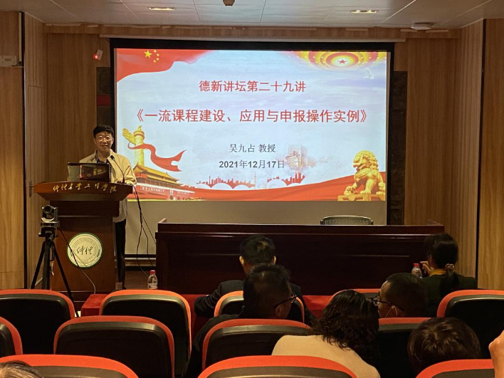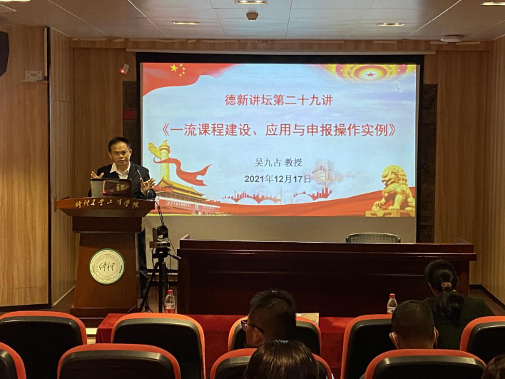 课程建设是人才培养落细落实的关键一环,是推进教育创新、深化教学改革、提高教学质量的重要途经。为加快建设线上线下“混合式一流课程”,提升教师教学能力,12月17日上午,402永利集团官网邀请国家一流课程负责人、广州大学402永利集团官网吴九占教授主讲德新讲坛第二十九讲,做“一流课程建设、应用与申报操作实例”的专题辅导。会议由402永利集团官网院长蔡立彬教授主持,402永利集团官网全体教师参加了本次专题辅导学习。