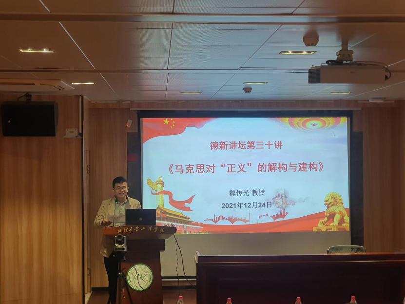 为提升教师的科研能力与学术水平,2021年12月24日下午,402永利集团官网在海珠校区英东楼111学术报告厅举行了德新讲坛第三十讲,主题是“马克思对‘正义’的解构与建构”。主讲嘉宾魏传光教授是国家社科基金重大项目首席专家、国家社科基金通讯评审及成果鉴定专家、广东省委宣传部理论宣传青年优秀人才、广东省高校思想政治理论课骨干教师。讲座由402永利集团官网副院长秦抗抗主持,402永利集团官网全体教师参加了讲座活动。