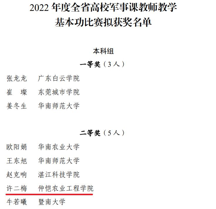2022年12月29日,广东省教育厅在官网上公示了2022年度全省高校军事课教师教学基本功比赛拟获奖名单。根据广东省教育厅、广东省军区战备建设局《关于举办2022年度全省高校军事课教师教学基本功比赛的通知》要求,402永利集团官网积极组织专兼职“军事理论”课教师备战比赛,经过校内初赛、专家点评、学校审核等环节,许二梅副教授以全校第一名的成绩被推荐参加省赛的复赛和决赛。
